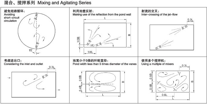 潜水搅拌机的安装定位对其揽拌效果有很大的影响,为了达到事半功倍的运行效果,我们建议用户按专业设计人员的要求去做,要充分专虑到水池的形状,进出水的位置以及搅拌机的水流反射到构筑物而引起的涡流等情况,尽量减少短路循环和死角的产生,避免与池壁的撞击而降低流速。参照下面的运行模式图,可帮助您合理选择搅拌机和安装形式。
