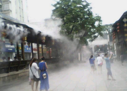 现在城市热岛效应变强,采用绿化降温不是最好的措施,实际上,绿化降温是因为99%以上的能量由于水的蒸发变成水的汽化热散失的,而采用喷雾降温其降温效率要高出很多,但喷雾降温用于公共场所其对水质要求很高。