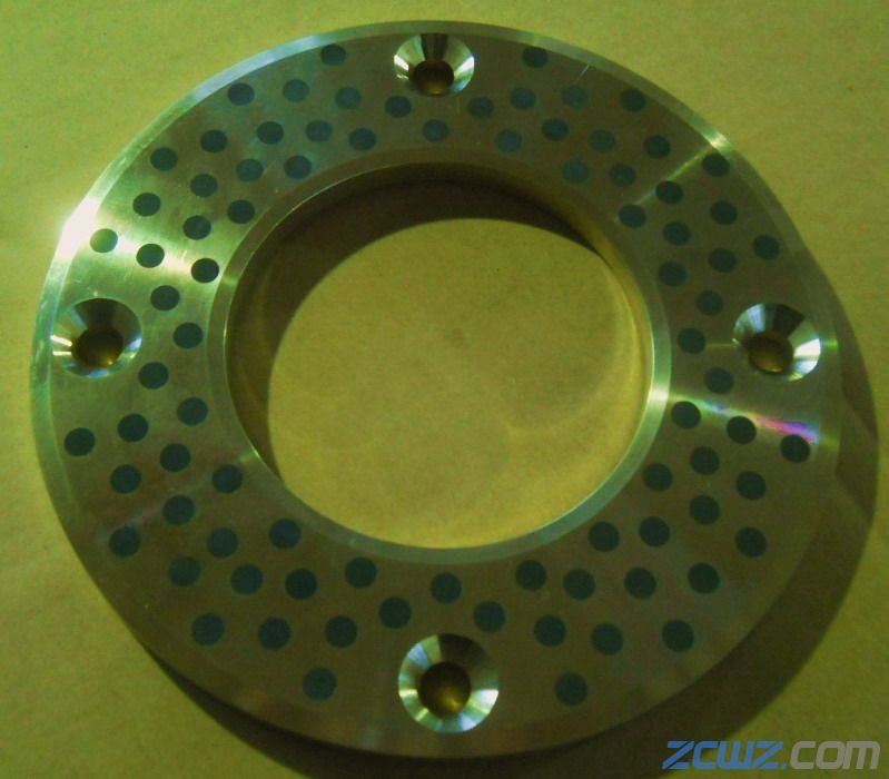 jtw铜基镶嵌式固体润滑止推垫片,是在高力黄铜的基体上。镶嵌石墨或mos2固体润滑剂的一种高性能固体润滑产品。它突破了一般轴承依靠油膜润滑的局限性。在使用过程中,通过摩擦热使固体润滑与轴摩擦,形成油、粉末并存润滑的优异条件,既保护轴不磨损,又使固体润滑特性永恒。它的硬度比一般铜套高一倍,耐磨性能也高一倍。