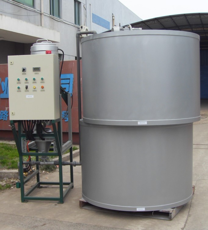 固液、液液(絮凝剂)溶液配制过程是通过上下溶液箱逐步处理完成的,溶液箱之间隔开,保证溶药箱内的最佳时间和恒定的浓度,避免在溶药箱和储存箱之间产生任何直接通路。系统由plc自动控制,控制箱与安装在溶液储存箱上的液位计相连,一旦贮药箱中液位达到“中位”,且溶液在溶药箱内完全溶解后,信号触发电动放药阀打开,将溶解充分的絮凝剂放到下贮药箱内;药粉的投加量的大小可以调节,以获得精确的浓度。自动情况下循环运行,确保系统时刻有成熟的溶解溶液使用。
