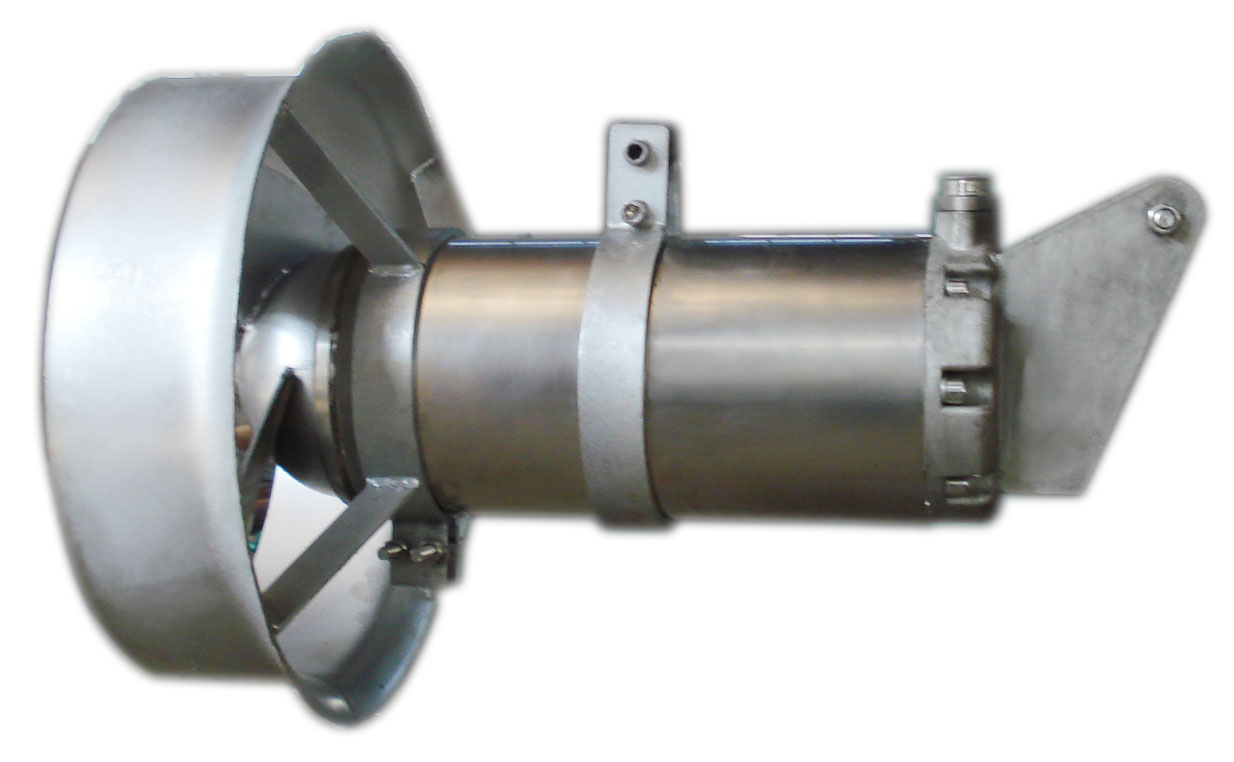 潜水推进器叶片为二叶橡胶形,钢制轮毂,有效防止了叶片的断裂问题,叶片进口边向后弯曲,具有永久自动清洗功能,用锁紧螺母紧固在轴上,在起吊维修时,容易拆卸更换。