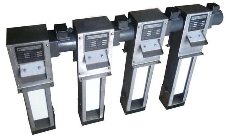 带式除油机由驱动电机、壳体、吸油带、刮油板、支撑架、驱动轮、从动轮和张紧装置组成。带式除油机是利用附油带的回转运动,连续不断的将浮油带出液面,并由固定在壳体上的刮板,将浮油刮入浮油箱内,以达到油水分离和浮油回收的目的。