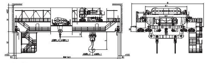 4、 另外,我公司的铸造起重机可提供以下功能,供用户选配:可旋转吊具;龙门钩钩距可变;载荷的称重及显示。
