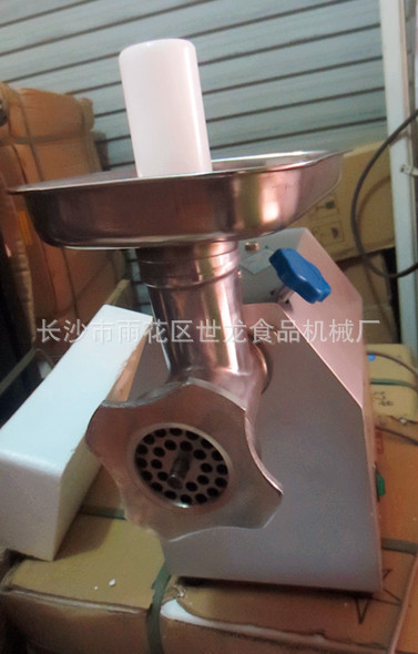 用于午餐肉罐头生产时,肥肉需要粗绞而瘦肉需要细绞,以调换格板的方式来达到粗绞与细绞之需。格板有几种不同规格的孔眼,通常粗绞用之直径为8-10毫米、细绞用直径3-5毫米的孔眼。粗绞与细绞的格板,其厚度都为10-12毫米普通钢板。由于粗绞孔径较大,排料较易,故螺旋供料器的转速可比细绞时快些,但最大不超过400转/分。一般在200-400转/分。因为格板上的孔眼总面积一定,即排料量一定,当供料螺旋转速太快时,使物料在切刀附近堵塞,造成负荷突然增加,对电动机有不良的影响。
