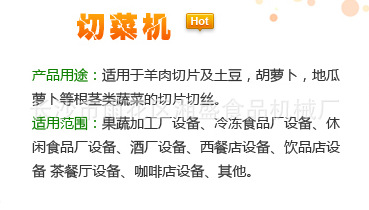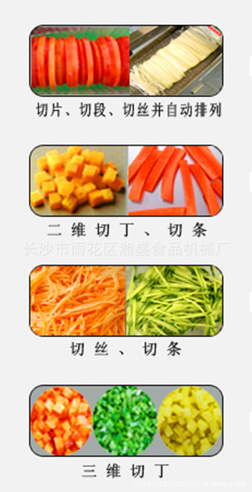 薯片薯条机(蔬菜切片切丝机)此设备操作方便,产量高,可以单独切片、切丝、切条,粗细厚薄可以自由调节,切出的片和丝光滑均匀,无破碎。