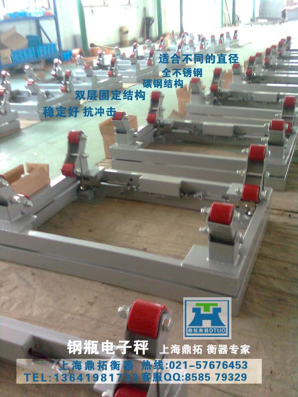 系统结构:液氯钢瓶秤计量装置主要由秤架、缓冲装置(氯瓶托架)、显示仪表:(显示仪表:可选:上限、下限重量报警功能、4~20ma电流输出信号、rs232接口或485接口)传感器、接线盒、可调支脚等组成。
